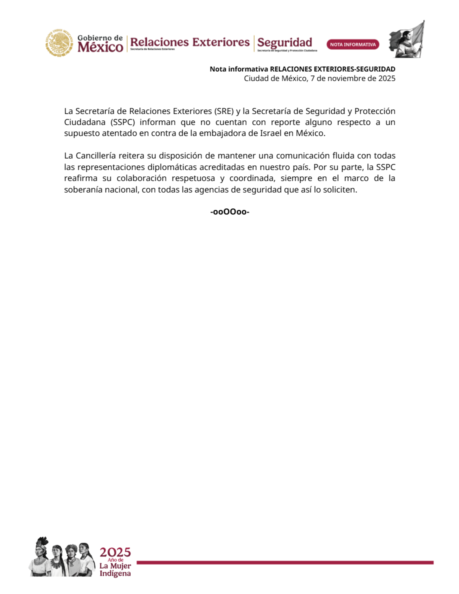 “La Secretaría de Relaciones Exteriores y la SSPC informan que no cuentan con reporte alguno respecto a un supuesto atentado en contra de la embajadora de Israel en México. La Cancillería reitera su disposición de mantener una comunicación fluida con todas las representaciones diplomáticas acreditadas en nuestro país”, indicó el mensaje.