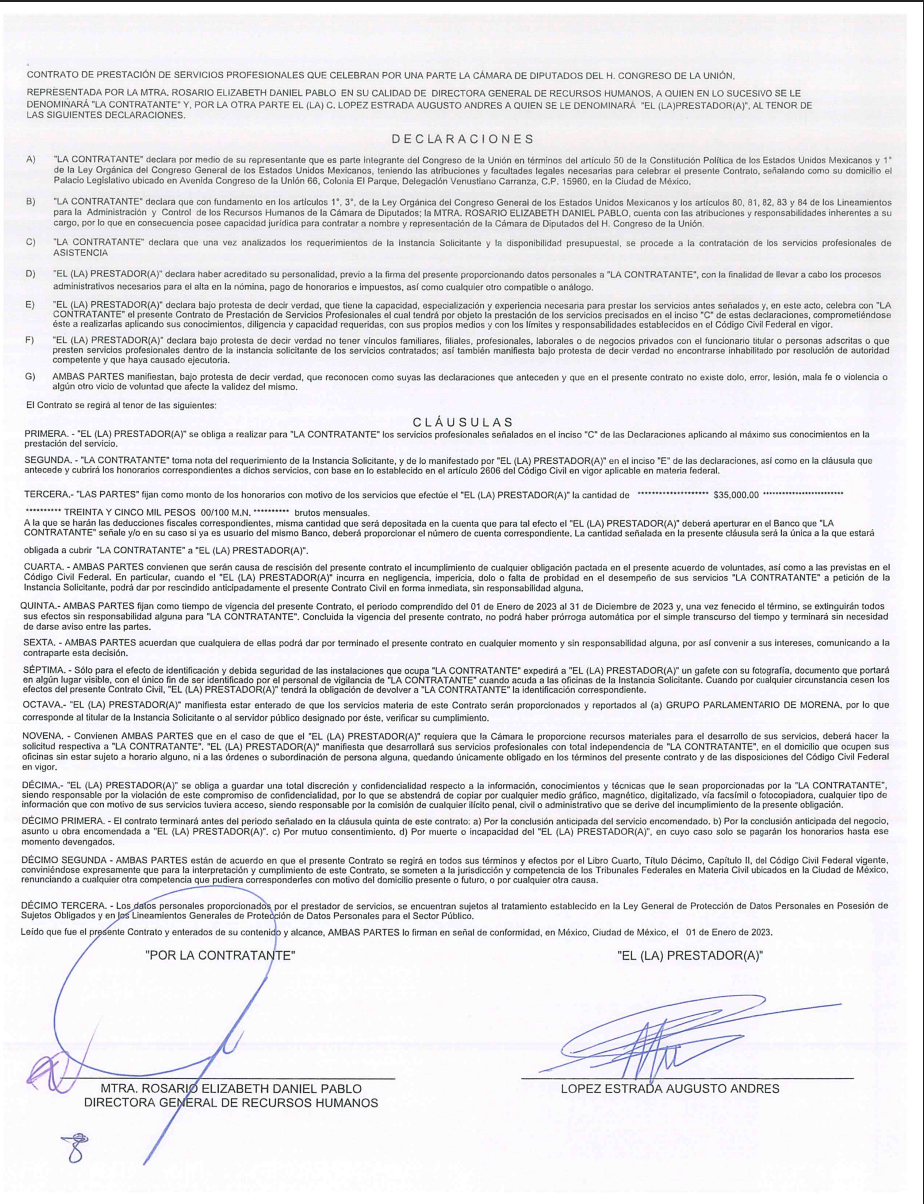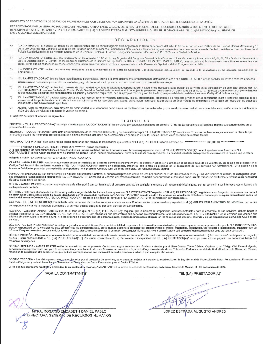 Los contratos fueron solicitados y gestionados directamente por el grupo parlamentario de Morena en la Cámara de Diputados. La Dirección General de Recursos Humanos, encabezada por Rosario Elizabeth Daniel Pablo, firmó los documentos que avalaron los pagos.