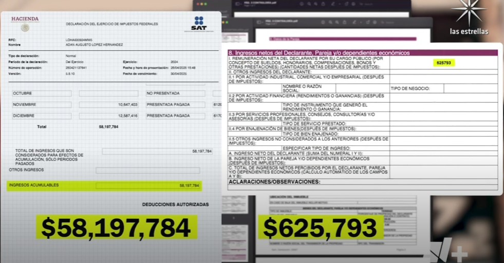 En 2023 declaró 7 millones de pesos, aunque habría obtenido al menos 22 millones en ese periodo. Para 2024, declaró ante el SAT más de 58 millones, pero ante la Contraloría de la Cámara de Senadores solo reportó 625 mil pesos.