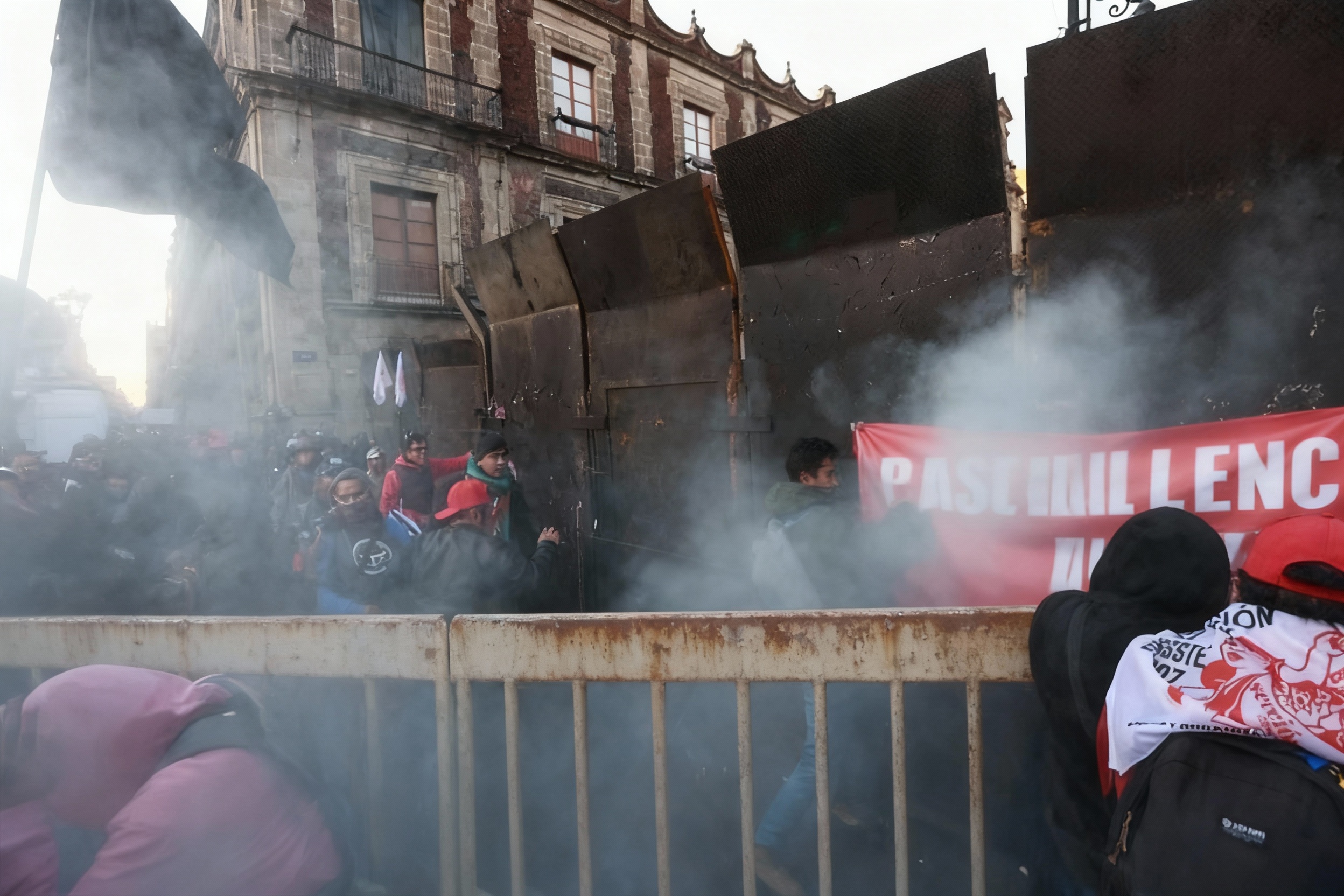 El momento más tenso de la protesta se registró cuando los maestros de la CNTE tratan de tirar valla de Palacio Nacional, empujando con fuerza coordinada mientras un grupo de policías de la Secretaría de Seguridad Ciudadana (SSC) del Gobierno de la Ciudad de México respondía con polvo de extintores y un gas irritante.