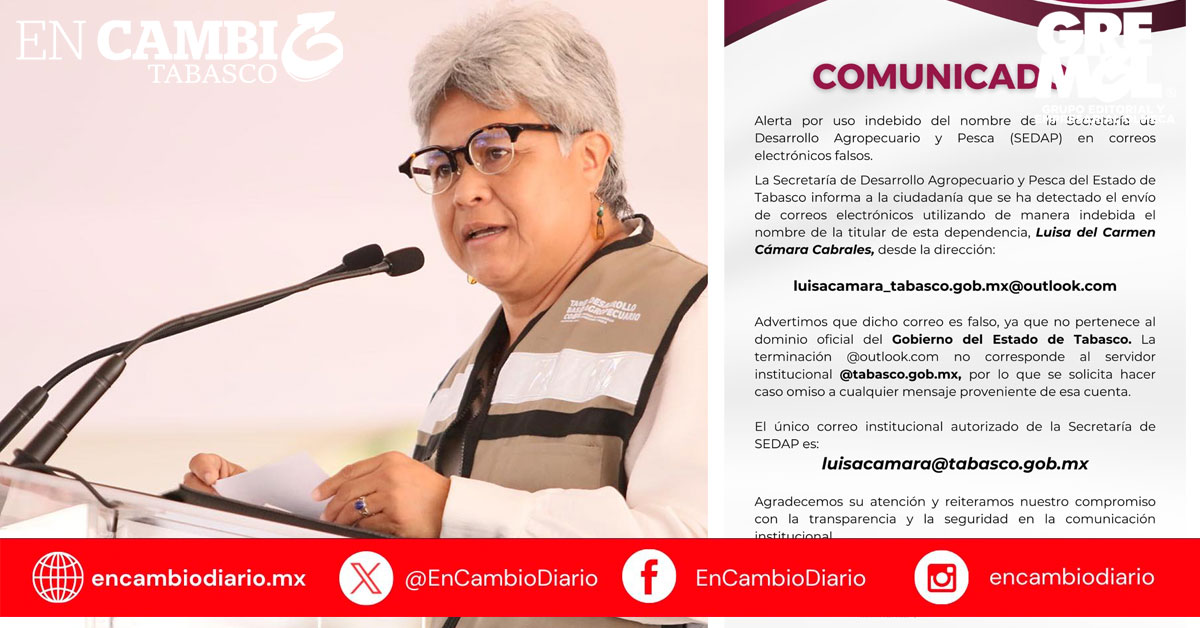 La Secretaría de Desarrollo Agropecuario y Pesca (SEDAP) del Estado de Tabasco alertó a la ciudadanía sobre el uso indebido del nombre de su titular, Luisa del Carmen Cámara Cabrales, en correos electrónicos enviados desde una dirección falsa.