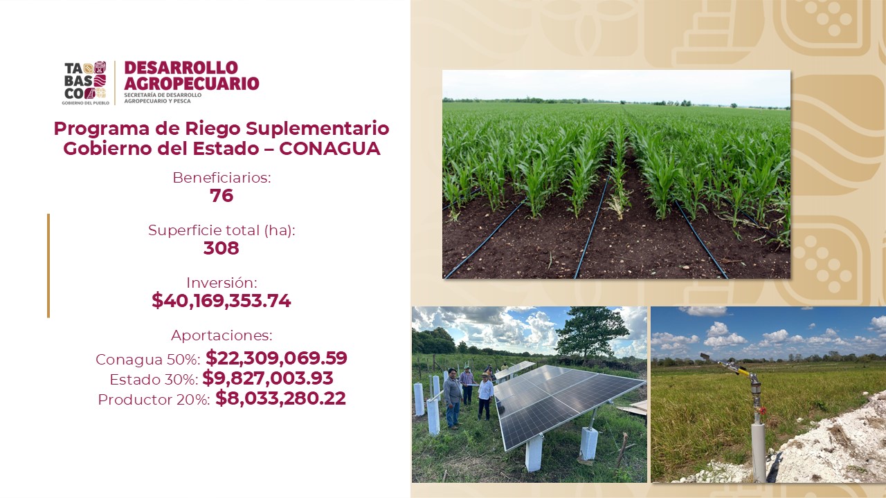 Detalló que, para tal efecto, por gestiones del Gobierno del Pueblo, la Conagua creó un fondo para dicho Programa de Riego Suplementario, con una inversión de más de 40 millones de pesos, con aportación 50 por ciento federal, 30 por ciento estatal y 20 por ciento los productores, que este año beneficiará a 76 agricultores y 38 hectáreas en 37 comunidades en los Distritos de Temporal Tecnificado 12 y 13 de los planes Chontalpa y Balancán-Tenosique.